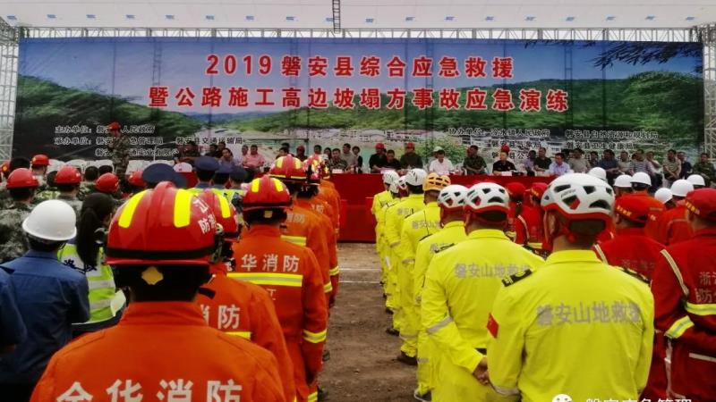 本次活動是由磐安縣人民政府主辦,42省道(二期)改建項目部與磐安縣應(yīng)急管理局、交通運輸局、交投公司等單位共同承辦,路橋工程公司書記朱華生、副總經(jīng)理曹剛也參加了這次觀摩演練。