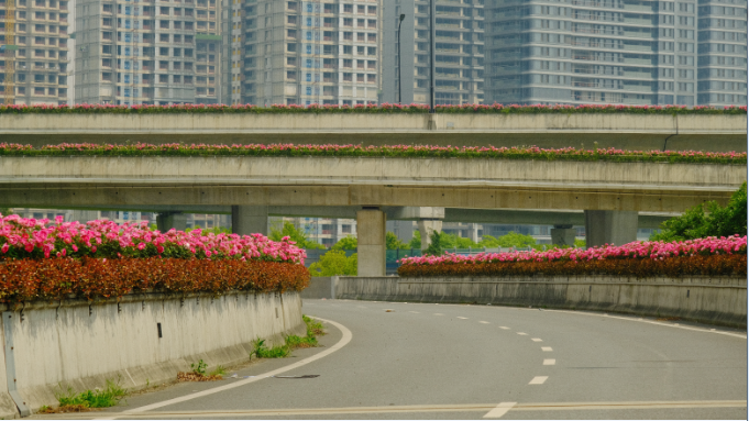 該路段綠化彩化最具特色的是,采用可循環、更生態的壘土代替傳統花箱,不添加環保負荷的同時改頂面種植為頂面加兩個側面三面種植。頂面栽植各色月季,兩側(原傳統花箱側面部分)分別花葉絡石、金葉絡石、菖蒲和麥冬等綠植相襯,植物通過多品種組合,營造生物多樣性自然系統,大大提升了高架綠化覆蓋率和碳匯能力,在傳統高架綠化基礎上共計增加約15200㎡綠量。