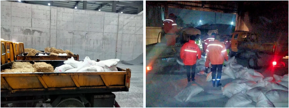 路橋工程公司立即啟動應急機制,成立應急抗雪搶險小分隊,25位小分隊成員放棄春節在家休息, 24小時在拌和中心候命,人、機、料集結到位,聞令而動,隨時待命。共組織預警搶險車5輛、鏟車3輛、工業鹽5噸、防滑草袋2000只,主要保障時代大道、塘新線及路橋各在建施工路段的道路安全。