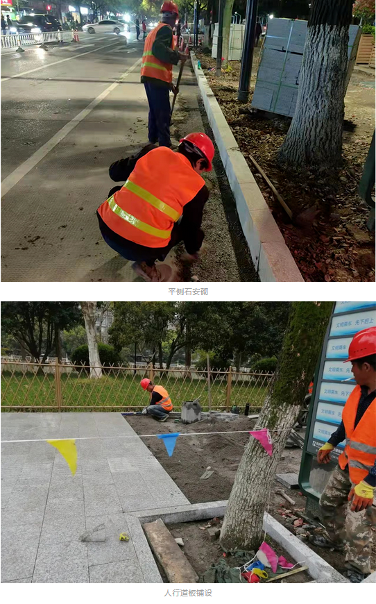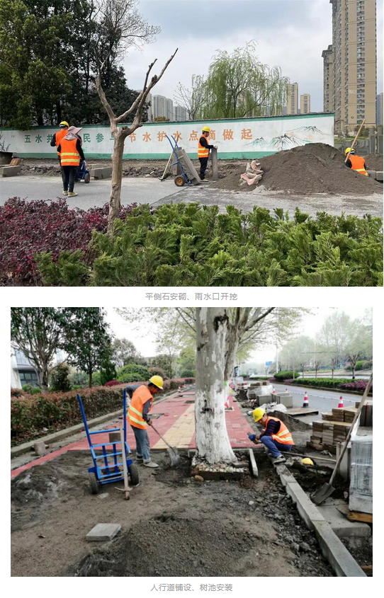 平側(cè)石拆除和安砌、人行道拆除已全部完成;人行道鋪設(shè)1195平方米,占總量的10.5%;雨水口新增全部完成。