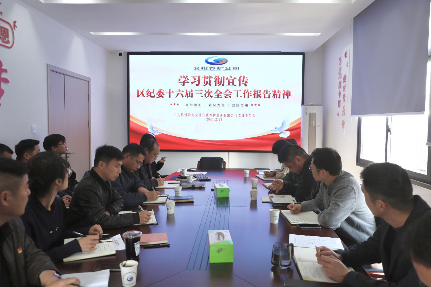 2月21日,交投養(yǎng)護(hù)公司結(jié)合主題黨日及黨風(fēng)廉政會(huì)議,組織全體黨員和中層以上干部,學(xué)習(xí)領(lǐng)會(huì)落實(shí)區(qū)紀(jì)委第十六屆三次全會(huì)精神。公司支部書(shū)記、總經(jīng)理徐全民,支部委員、副總經(jīng)理陳沈杰,全體黨員、入黨積極分子,中層以上干部,財(cái)務(wù)工作人員參加會(huì)議。