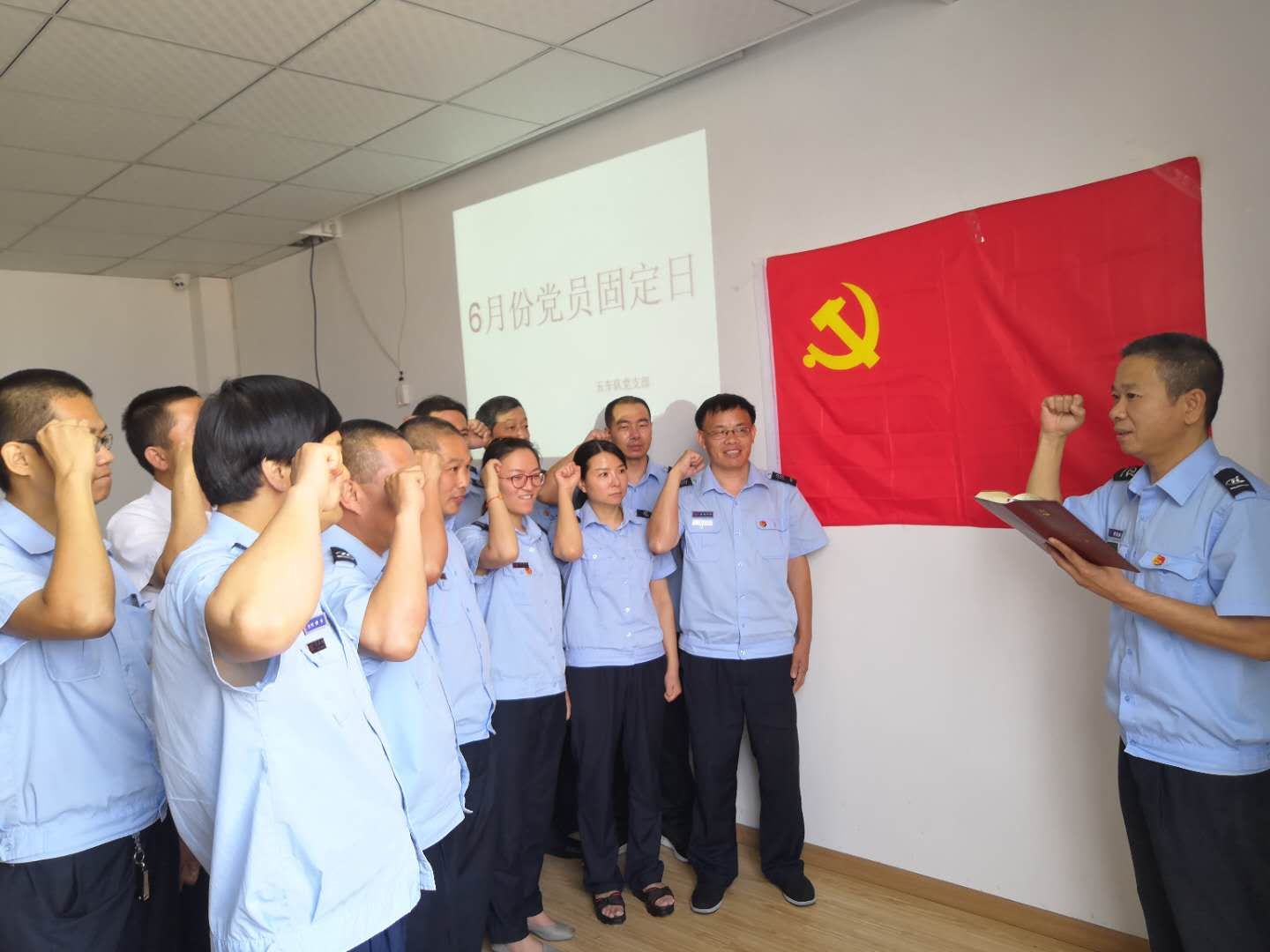活動突出黨建引領,面向工作實際,具體抓好以下幾方面工作:一是確定黨員干部聯系服務職工群眾的最終名單及實施步驟;二是交叉互查黨員干部“三本賬”(工作日志、情親賬本、廉政賬本);三是傳達學習《關于開展紀念建黨97周年系列活動的通知》《關于開展“作風建設提升月”活動的通知》等文件精神;四是觀看“廉潔好家風”主題教育片;五是開展“黨員政治生日”“五個一”活動,舉行黨員重溫入黨宣誓儀式;六是開展紀律知識測試;七是對入黨積極分子E平臺在線學習、區改革開放40周年征文活動、鴻達路停保基地植樹活動等工作進行宣傳動員。同時,行政一、二支部還前往休博園社區聯合開展黨員服務進社區活動;行政四支部到蒙山路運河河道周邊進行環境美化志愿服務;六車隊支部則開展了職工家屬座談會暨“好家風,好家規”分享會。